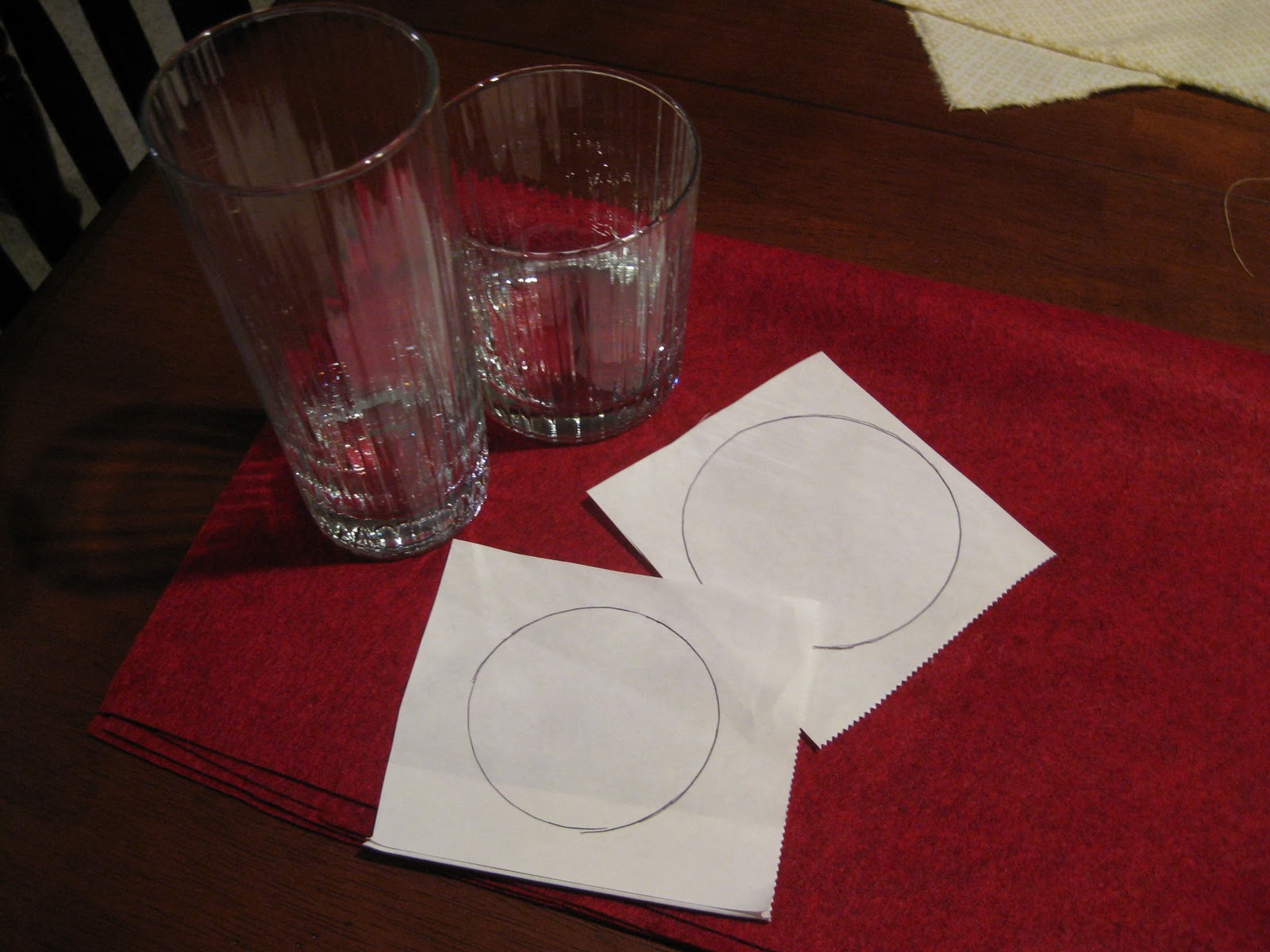 Using 2 different size circles as a pattern, cut out your felt. I used 2 glasses and some spare paper. Cut about 25-30 large circles and about 20 small circles. Cut all the circles in half.